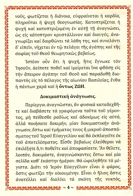 Καί στό πρόσωπό σας τιμοῦμε τόν Πνευματικό Πατέρα καί χειραγωγό ψυχῶν, τόν Γέροντα προστάτη καί ὁδηγό πολλῶν ἀνθρώπων, τόν ποιμένα καί διδάσκαλον, τόν συναντιλήπτορα καί βοηθόν, τόν πονοῦντα τούς «πονεμένους» καί θεραπεύοντα τούς ἐν θλίψει καί ἀθυμίᾳ, τόν χαριτώσαντα πολλούς ἐξ ἡμῶν διά τῆς χάριτος τῶν ἐκκλησιαστικῶν Μυστηρίων, τόν ἐπίσκοπον καί ἐπισκοποῦντα πατρικῶς διά τάς ψυχάς ζώντων καί ἀπελθόντων εἰς τάς αἰωνίους μονάς, τόν ἀγωνιζόμενον καί κηδόμενον νύκτα καί ἡμέρα πιστόν Ἀρχιερέα διά τήν ὀρθόδοξον πίστιν καί τήν ἠθικήν τιμήν, τόν κεκοπιακότα λειτουργόν διά τήν πνευματικήν ἐξυπηρέτησιν καί τοῦ ἐλαχίστου ἀδελφοῦ τοῦ Κυρίου καί ἄχρι τοῦ νῦν ἐπιβλέποντα καί ἐπερωτῶντα διά τήν πνευματικήν παρηγορίαν καί ἐκκλησιαστικήν μυστηριακήν ἐξυπηρέτησιν τῶν ἐν ἀνάγκαις ἀδελφῶν, γνωστῶν καί ἀγνώστων, ἐχόντων καί πενομένων, φίλων καί ἐναντίων, παρακαλούντων καί ἀπαιτούντων, εὐεργετηθέντων καί ἀχαρίστων, τόν ἀείποτε προσευχόμενον ἐκ καρδίας ζεούσης καί νοός ζωτικοῦ καί ἀεικινήτου καί παρακινοῦντα πρός τήν προσευχήν, τήν μελέτην, τήν ἀναδίφησιν καί ἀναζωογόνησιν τῆς γνώσεως καί τῆς ἐμπειρίας, τόν γεγηρακότα κατά τό μέτρον τοῦ χρόνου καί νεάζοντα κατά τήν διάθεσιν τῆς ψυχῆς καί τήν ἱκανότητα τῆς μνήμης καί τῆς κρίσεως, τόν μή βλέποντα, ἀλλά διαβλέποντα ἐναργέστερον τῶν βλεπόντων, τόν μή ἀκούοντα διά τῆς ἀκοῆς, ἀλλά ἐπακούοντα θαλερῶς τά θελήματα τοῦ Θεοῦ καί τίς ἀνάγκες τῶν ἀνθρώπων, τόν μή δυνάμενον νά μετακινηθῆ εὐχερῶς, ἀλλά ἀεικίνητον καί εὐχερέστερον τῶν ὑγιεστέρων μετακινούμενον καί ἐπισκεπτόμενον νοερῶς ἤ τηλεακουστικῶς τούς ἐργαζομένους ἤ ἐπιθυμοῦντας νά ἐργασθοῦν τό ἔργον τοῦ Θεοῦ.